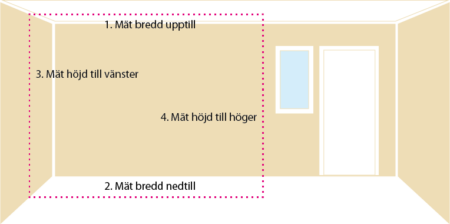 Längre ner på sidan kan du fylla i dina önskningar i ett formulär som skickas till oss. Börja dock med att mäta det aktuella utrymmet i ditt hem. För bästa måttanpassning ber vi dig mäta bredd både upptill1 och nedtill2 samt höjd både på vänster3 och höger4 sida.